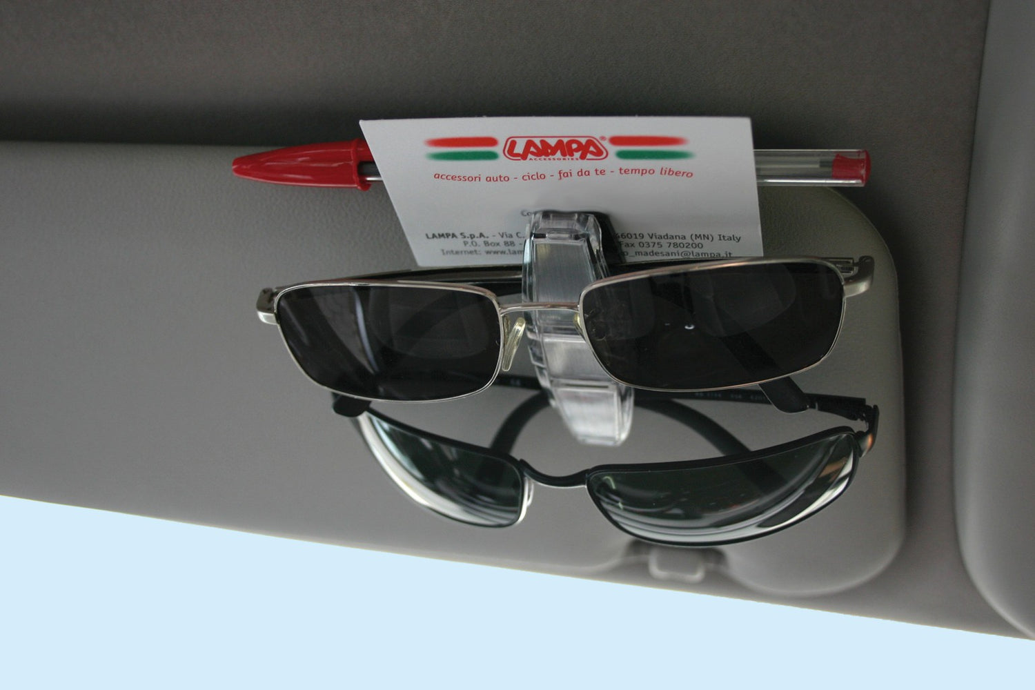 Per due paia di occhiali, 1 biro e 1 biglietto o foglio. Si applica all’aletta parasole. Universale