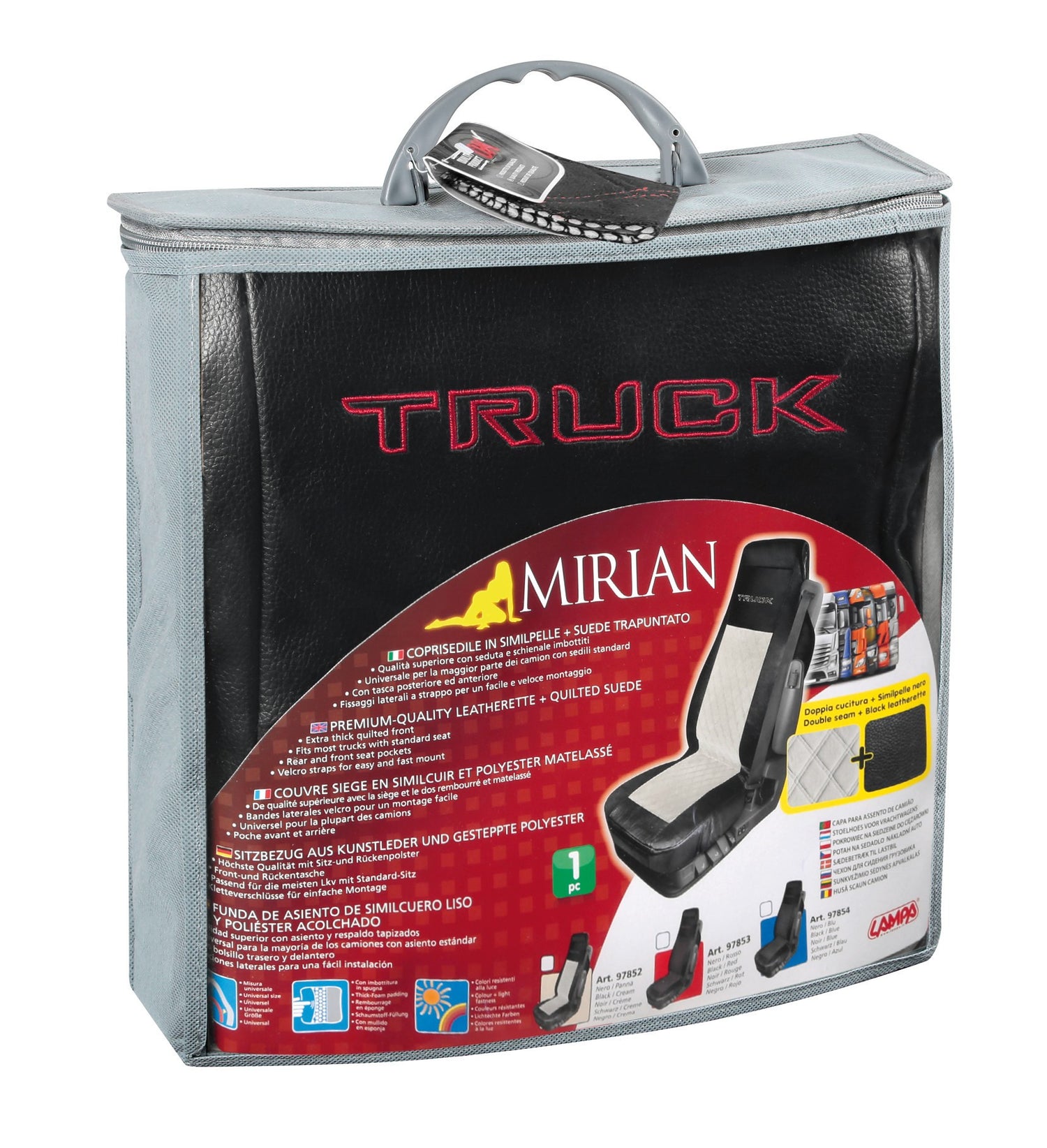- _x0001_Qualità superiore con seduta e schienale imbottiti. - _x0001_Universale per la maggior parte dei camion con sedili standard. - _x0001_Con tasca posteriore ed anteriore. - _x0001_Fissaggi laterali a strappo per un facile e veloce montaggio.