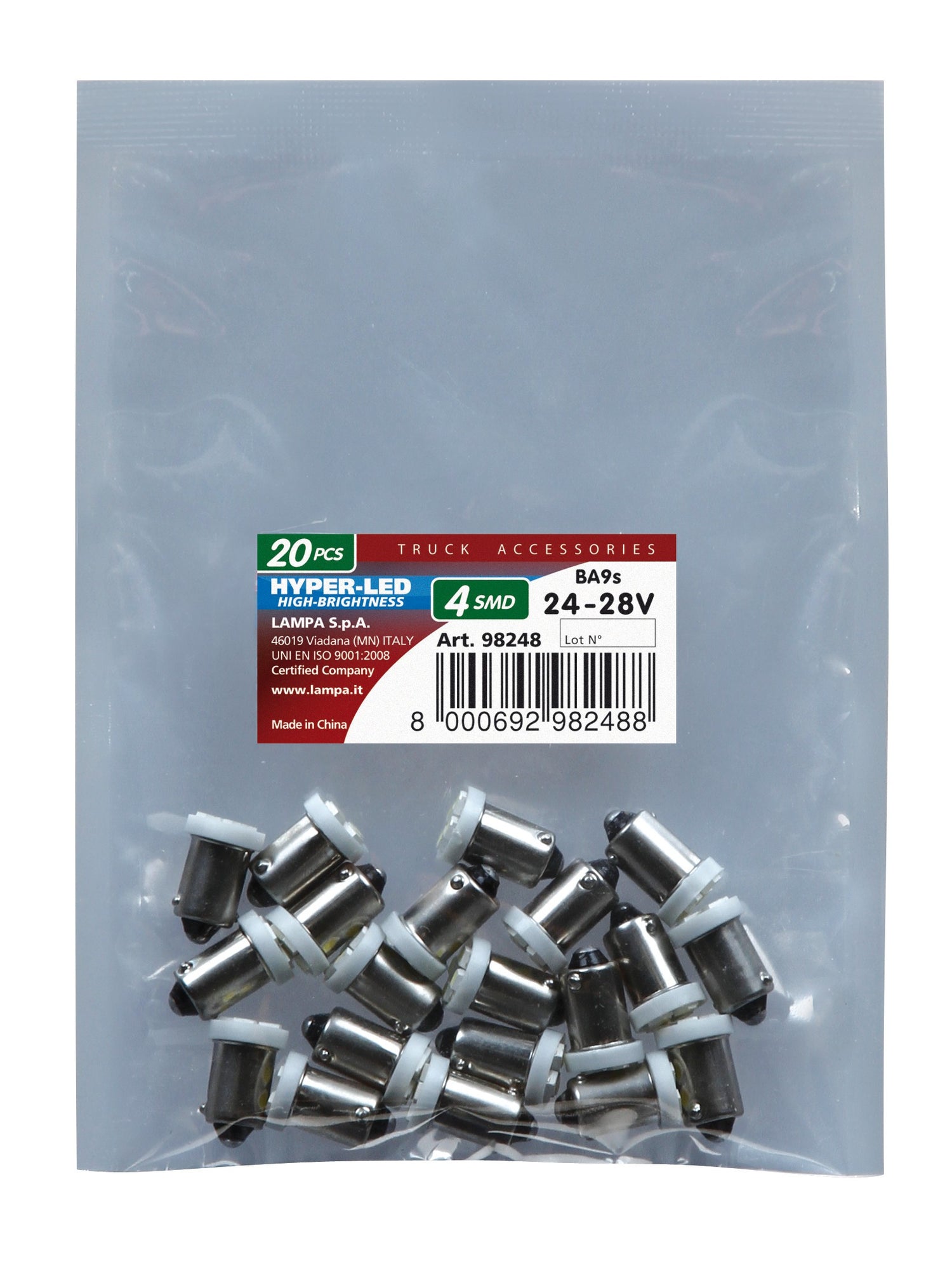 24/28V Hyper-Led 4 - 4 SMD x 1 chips - (T4W) - BA9s - 20 pz - Busta - Bianco - Doppia polarità