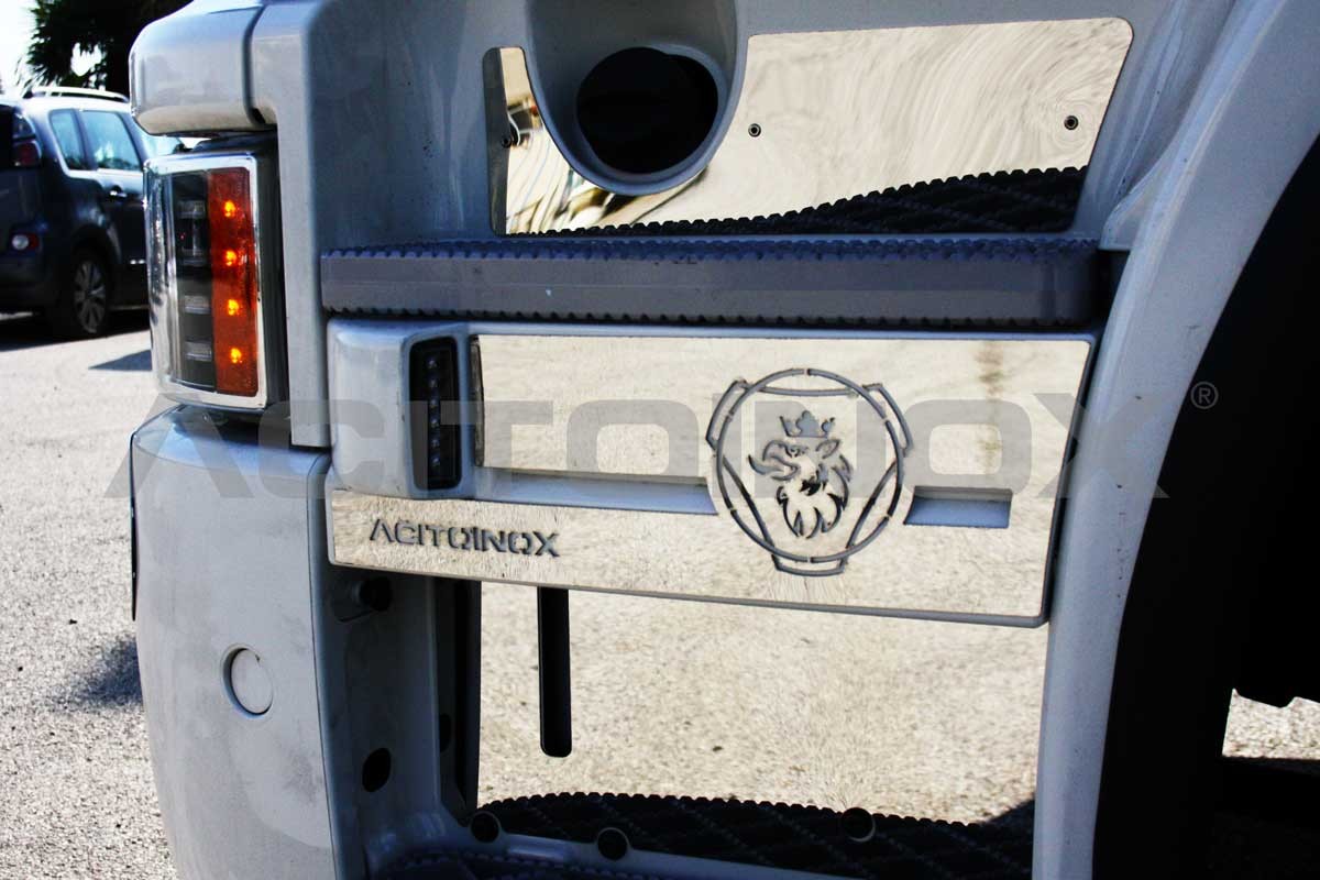 Applicazione indicatori di direzione in acciaio inox super mirror (aisi 304) per Scania Streamline. Personalizzabile con scritta.